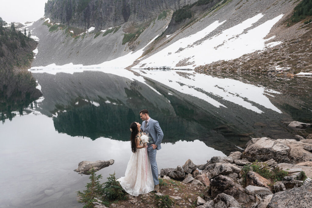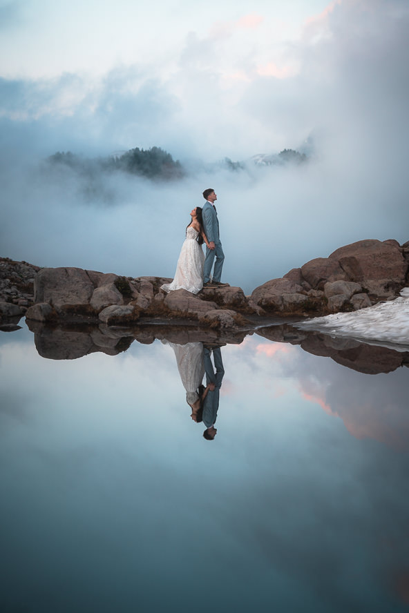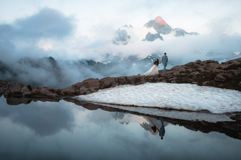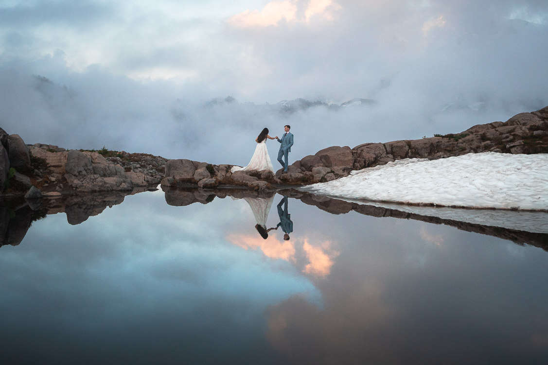 Our grand finale was at Artist Point. This was actually a few minutes walk from the ceremony I found for them so it was convenient after their vows. We got super lucky with the weather. So lucky that the wind was incredibly still and we were able to take reflection photos for sunset because of how calm the water was. It was the perfect mirror for an artist, symmetrical photo.