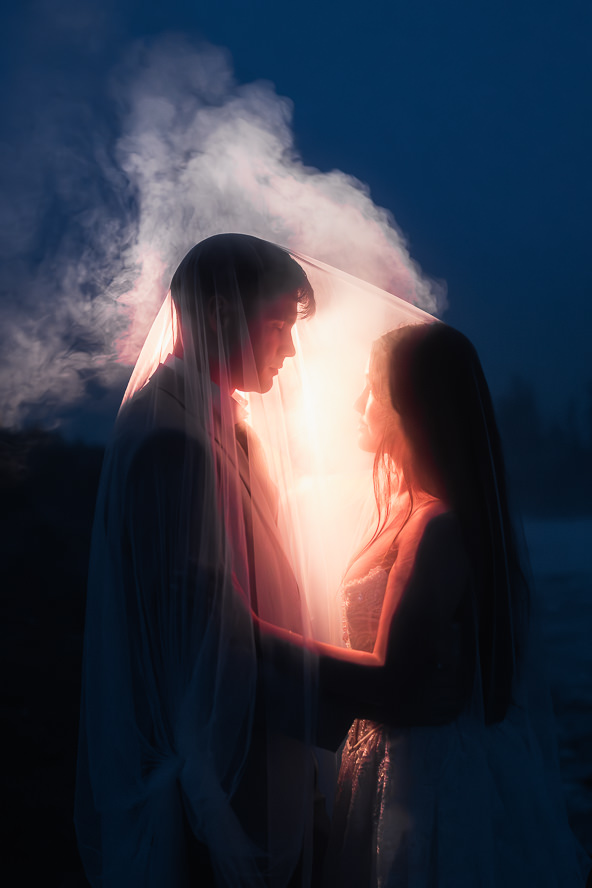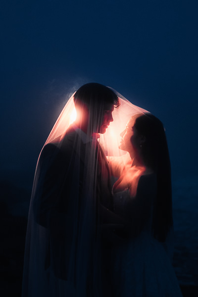 During blue hour, everything went quiet and cool-toned. To warm it back up, they flipped on a few soft orange lights and we tried a few photo tricks with their veil.