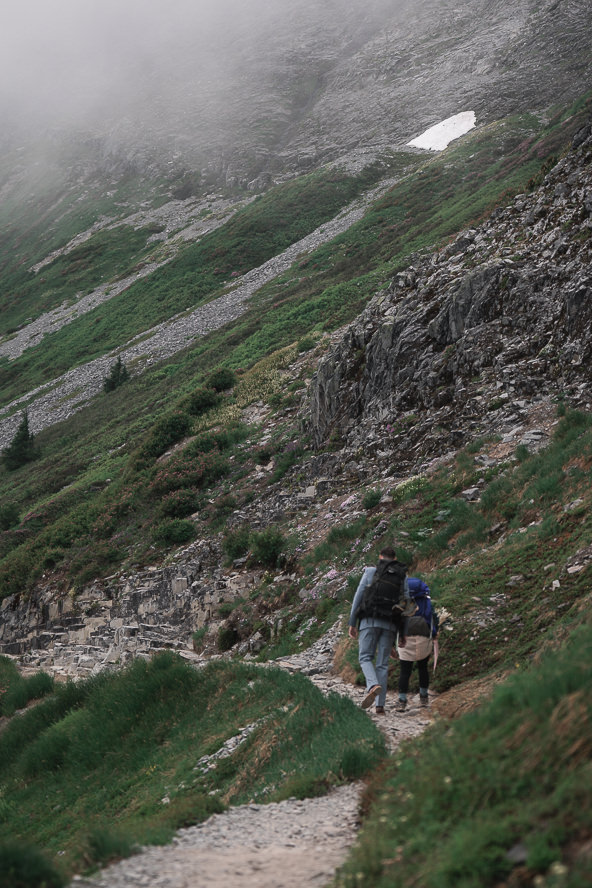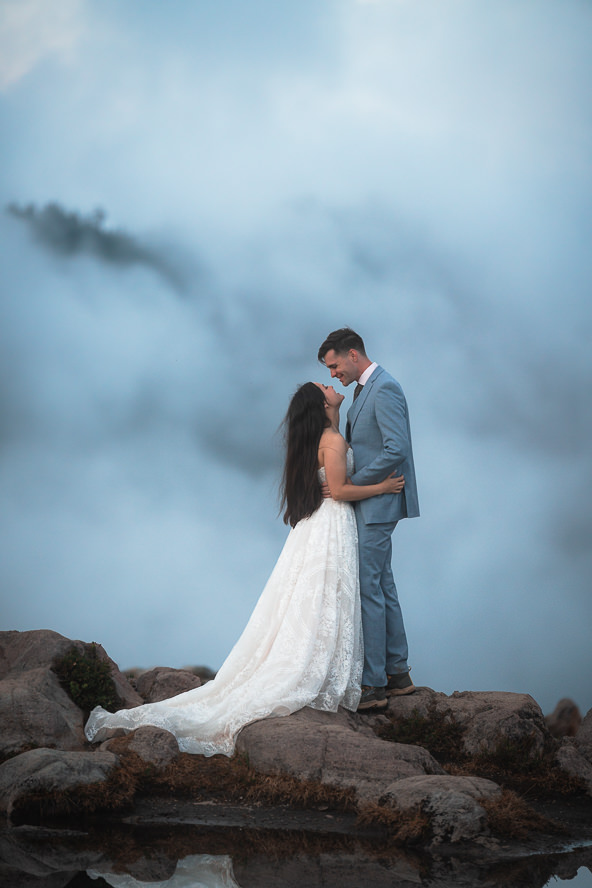 They reached their ceremony location before sunset. Stood on an alpine ridgeline, and had an emotional vow. During this the sun began to glow beautifully as the sun was setting. Behind them was a steep rocky terrain that was rising out of a dense forest, with low clouds and mist drifting across the peak. After their vow they had one of the most tender hug I’ve ever seen. This moment was such a dream.